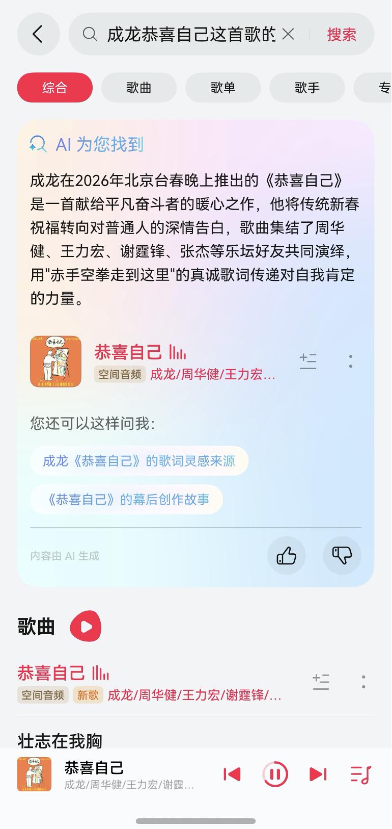 听完歌还想了解下这首歌的幕后故事,我直接在华为音乐的搜索栏输入“成龙《恭喜自己》这首歌的创作背景”。这才知道大哥成龙这首歌是专程给平凡奋斗者的暖心之作!五个男人加起来两百多岁,唱的不是岁月,而是给大家传达自我肯定的力量。感谢成龙大哥和几位乐坛好友的用心,新年我会带着这份“力量”继续前行!